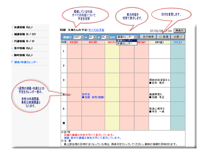 「講義カレンダー」では、通常授業は黒色、休講関連は赤色、補講関連は青色の文字で表示されます。